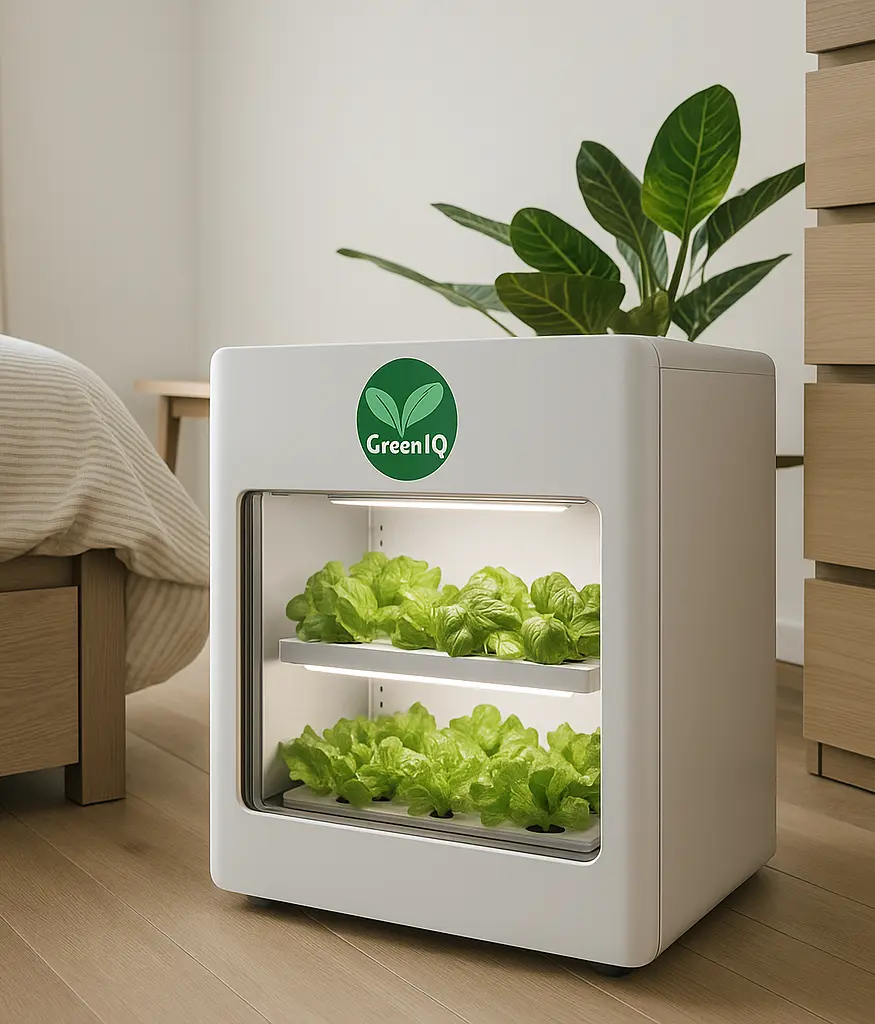 Tủ trồng rau thông minh Green IQ tự động tưới, chiếu sáng và cấp dinh dưỡng. Linh hoạt 1–4 tầng (tối đa 48 khay), thu hoạch 365 ngày/năm, không đất – không thuốc. Điều khiển & theo dõi trên App, an toàn cho cả gia đình.